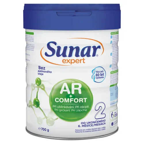 Dojčenie je pre novorodencov a dojčatá najlepší spôsob výživy. Sunar Expert AR+Comfort 2 je dojčenská výživa určená ako súčasť zmiešanej stravy pre dojčatá od ukončeného 6. mesiaca, pokiaľ nemôžu byť dojčené a nie je vhodný ako jediný zdroj výživy. Sunar Expert AR+Comfort 2 nie je určený ako náhrada materského mlieka v prvých 6 mesiacoch života dojčaťa. Sunar Expert AR+Comfort 2 používajte len pod lekárskym dohľadom. Odporúčané denné dávky mlieka sú orientačné, riaďte sa individuálne potrebou dieťaťa a odporúčaním pediatra. Pre zdravie dojčiat a malých detí je dôležité správne dodržiavanie návodu na prípravu, používajte len priloženú odmerku, nemeňte pomer prášku a vody. Pre každé kŕmenie používajte vždy čerstvo namiešanú porciu. Nespotrebovanú porciu neuchovávajte a znova nepodávajte. Pripravené mlieko ihneď spotrebujte - najneskôr do 1 hodiny. Pri kŕmení nenechávajte dieťa bez dozoru, hrozí riziko zakuckania. Akékoľvek ďalšie otázky ohľadom prípravy a dávkovania konzultujte s ošetrujúcim lekárom. O zavádzaní prvých príkrmov sa tiež poraďte s ošetrujúcim lekárom s ohľadom na zdravotný stav a celkový vývoj dieťaťa. Pri nesprávnom skladovaní a nedodržaním správneho návodu na prípravu môže dôjsť k ohrozeniu zdravia dieťaťa. Po konzumácii mlieka najmä pred spaním dbajte na hygienu ústnej dutiny.