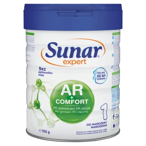 Dojčenie je pre novorodencov a dojčatá najlepší spôsob výživy. Sunar Expert AR+Comfort 1 je nutrične kompletná dojčenská výživa vhodná ako jediný zdroj výživy pre dojčatá od narodenia, pokiaľ nemôžu byť dojčené. Sunar Expert AR+Comfort 1 používajte len pod lekárskym dohľadom. Odporúčané denné dávky mlieka sú orientačné, riaďte sa individuálne potrebou dieťaťa a odporúčaním pediatra. Pre zdravie dojčiat a malých detí je dôležité správne dodržiavanie návodu na prípravu, používajte len priloženú odmerku, nemeňte pomer prášku a vody. Pre každé kŕmenie používajte vždy čerstvo namiešanú porciu. Nespotrebovanú porciu neuchovávajte a znova nepodávajte. Pripravené mlieko ihneď spotrebujte - najneskôr do 1 hodiny. Pri kŕmení nenechávajte dieťa bez dozoru, hrozí riziko zakuckania. Akékoľvek ďalšie otázky ohľadom prípravy a dávkovania konzultujte s ošetrujúcim lekárom. Pri nesprávnom skladovaní a nedodržaním správneho návodu na prípravu môže dôjsť k ohrozeniu zdravia dieťaťa. Po konzumácii mlieka najmä pred spaním dbajte na hygienu ústnej dutiny.