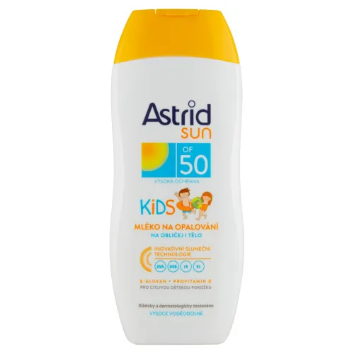 Astrid Sun Detské mlieko na opaľovanie OF 50 s inovatívnou slnečnou technológiou (UVA/UVB/IR*XVL*) poskytuje pokožke širokospektrálnu fotostabilnú ochranu pred škodlivými vplyvmi UV a infračerveného žiarenia a viditeľného svetla. Zloženie bolo vyvinuté tak, aby sa minimalizovalo riziko alergických reakcií.