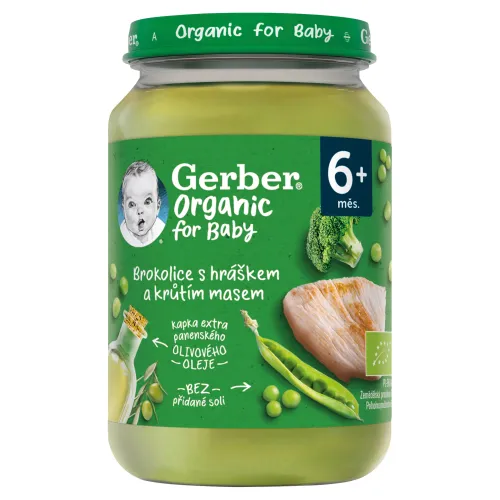 GERBER Organic detský príkrm brokolica s hráškom a morčacím mäsom je mäsovo-zeleninový príkrm od ukončeného 6. mesiaca. Lahodný príkrm pomôže vášmu malému chrobáčikovi sa lepšie oboznámiť s chuťou brokolice a hrášku a morčacieho mäsa. Hladká konzistencia bola prispôsobená potrebám a zručnostiam malých detí.