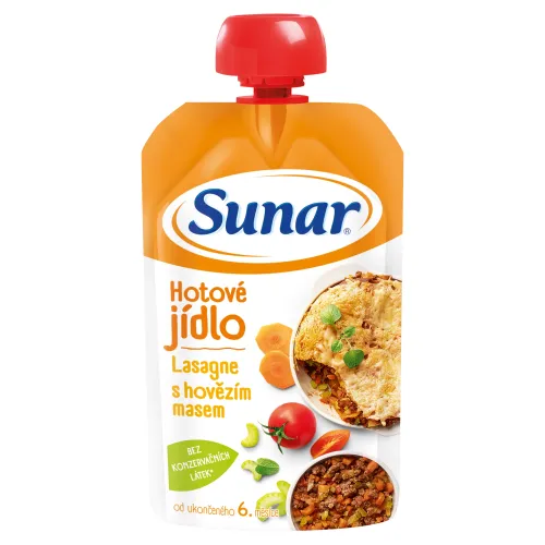 - Sunar hotové jedlo v kapsičke váži 120 g a je možné si vybrať zo štyroch variantov, ktoré sú určené pre deti od uk. 6. mesiace.