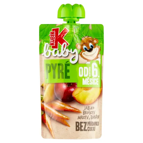 Zloženie: Pretlaky z: jablka (32%), broskyne (32%), mrkvy (25%) a banánu (10%), Jablková šťava z koncentrátu (1 %), Vitamín C (kyselina L-askorbová)