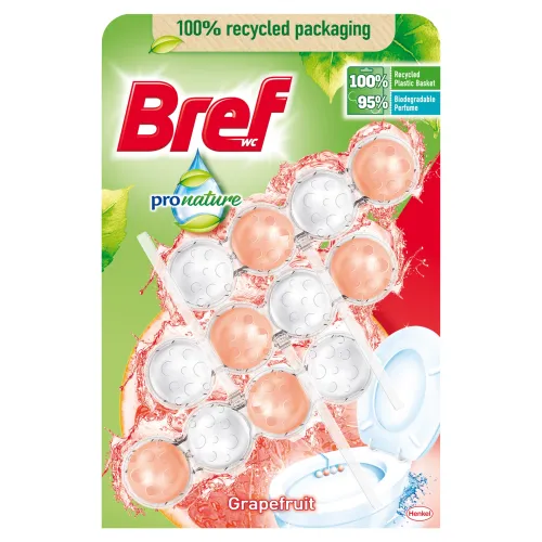 WC blok Bref Pro Nature s prírodným zložením a udržateľným balením ponúka čistiaci výkon, ochranu pred vodným kameňom a odstraňovanie nečistôt s ohľadom na životné prostredie. Tento WC čistič obsahuje 95 % biologicky odbúrateľných parfumov. Grapefruitový parfum inšpirovaný prírodou poskytuje sviežu vôňu pri každom spláchnutí. Obal a košíček sú vyrobené zo 100 % recyklovaného materiálu.
