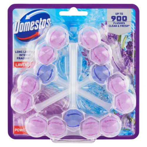 Domestos Power 5 pre hygienickú čistotu! Balenie obsahuje 3 ks WC bloku - vydrží tak až 900 spláchnutí*! Prevoňajte vašu toaletu dlhotrvajúcou sviežou vôňou levandule vďaka tuhému WC bloku značky Domestos, ktorá je tým pravým odborníkom na udržanie čistoty v domácnosti už niekoľko rokov. Domestos Power 5 Lavender perfektne ochráni vašu toaletu pred vodným kameňom. Toaletná misa bude čistá s viditeľným leskom. Pri každom spláchnutí vytvorí WC blok Domestos Power 5 Lavender bohatú penu s príjemnou vôňou.