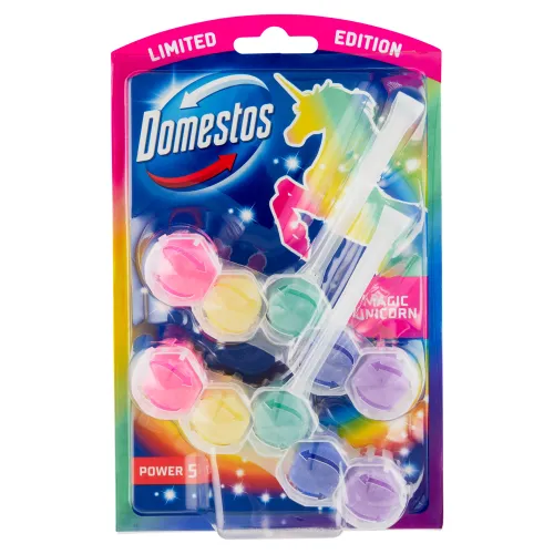 Sila v každom spláchnutí! Udržiavanie sviežosti a čistoty vášho WC nebolo nikdy tak jednoduché ako so závesným WC blokom Domestos Power 5 Magic Unicorn. Tento účinný závesný wc blok má nie jednu, ale hneď päť kľúčových výhod pre úžasnú čistotu a mimoriadnu sviežosť. S každým jednotlivým spláchnutím uvoľňuje blok Power 5 pod okraj toaletnej misy bohatú penu, ktorá odstraňuje nečistoty, poskytuje prevenciu pred vodným kameňom a zároveň uvoľňuje sviežu a dlhotrvajúcu vôňu.