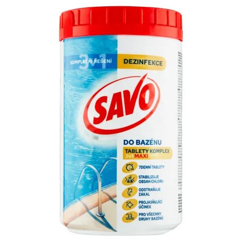 Dezinfekčné tablety do bazéna sa používajú na vyčistenie vody od mikroorganizmov, ktorým sa najlepšie darí v znečistenej vode a teplote nad 20 stupňov. Savo chlórové mini tablety 3v1 slúžia na udržiavanie stabilnej hladiny voľného chlóru, efektívne eliminujú mikrooranismy vo vode a rozpúšťajú sa sa postupne v bazéne. Oproti klasickým Savo mini tabletám ponúka viac benefitov, ako je napríklad odstránenie zákalu a prejasnenie vody. Chlórové tablety ich treba používať preventívne, aj keď je voda v bazéne na prvý pohľad čistá. Sú určené najmä pre väčšie bazény (20-30 m³ vody).
