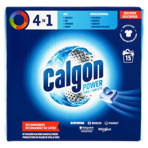 Bezpečnosť: Calgon 4 v 1 Power tablety. Uchovávajte mimo dosahu detí. Nesmie prísť do kontaktu s očami. V prípade kontaktu s očami je potrebné ich dôkladne vypláchnuť vodou. Nekonzumujte. V prípade požitia výrobku vyhľadajte lekársku pomoc.