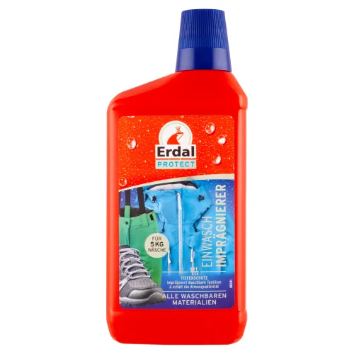 Erdal Impregnácia na pranie sa používa na účinnú opätovnú impregnáciu prateľných funkčných textílií, ako sú športové a outdoorové odevy, prateľná obuv alebo slnečné plachty. Špeciálne zloženie poskytuje spoľahlivú a dlhotrvajúcu hĺbkovú ochranu proti vlhkosti. Impregnácia Erdal zachováva membránovú funkciu priedušného oblečenia a dosahuje plný výkon aj bez tepelnej úpravy v sušičke.