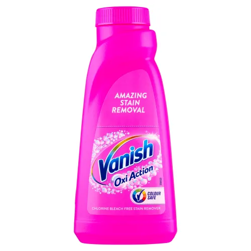 Vanish Oxi Action Tekutý odstraňovač škvŕn. Nebezpečné zložky: peroxid vodíka; C12-18-alkylalkoholy, etoxylované; C12-16-alkylalkoholy, etoxylované; kyselina benzénsulfónová, C10-13-alkylderiváty, sodné soli. Spôsobuje vážne poškodenie očí.