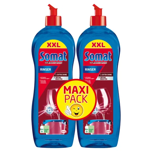 Doprajte si lesklý a suchý riad a poháre s leštidlom Somat. Vďaka vylepšenému zloženiu na ochranu skla zažijú vaše poháre a riad extra rýchloschnúci efekt. Je obzvlášť účinný na plastoch. Leštidlo Somat do umývačky riadu sa dodáva v 100 % recyklovanom plastovom obale.