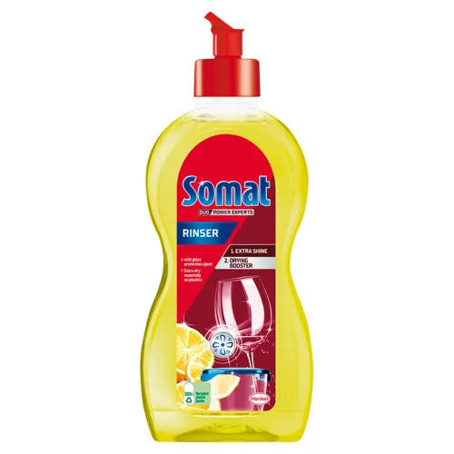 Doprajte si lesklý a suchý riad a poháre s leštidlom Somat. Vďaka vylepšenému zloženiu na ochranu skla zažijú vaše poháre a riad extra rýchloschnúci efekt a sviežu citrónovú vôňu. Je obzvlášť účinný na plastoch. Leštidlo Somat do umývačky riadu sa dodáva v 100 % recyklovanom plastovom obale.