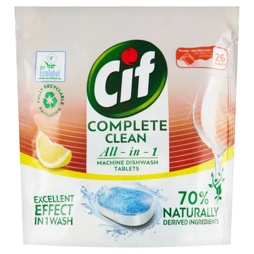 Kompletné riešenie v 1 tablete: Nové tablety Cif odstraňujú odolné škvrny a zabezpečujú žiarivo čistý riad pri každom umytí. Zároveň spĺňajú požiadavky Ecolabel.