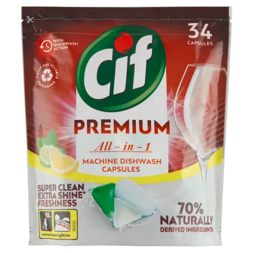 Bezpečnosť: Cif PREMIUM All in 1 Lemon kapsuly do umývačky riadu. Spôsobuje vážne podráždenie očí. Ak je potrebná lekárska pomoc, majte k dispozícii obal alebo etiketu výrobku. Uchovávajte mimo dosahu detí. Noste ochranné rukavice/ochranné okuliare. PO ZASIAHNUTÍ OČÍ: Niekoľko minút ich opatrne vyplachujte vodou. Ak používate kontaktné šošovky a je to možné, odstráňte ich. Pokračujte vo vyplachovaní. Ak podráždenie očí pretrváva: vyhľadajte lekársku pomoc/starostlivosť. Obsahuje amyláza, 1,2-benzizotiazol-3(2H)-ón, subtilizín. Môže vyvolať alergickú reakciu.