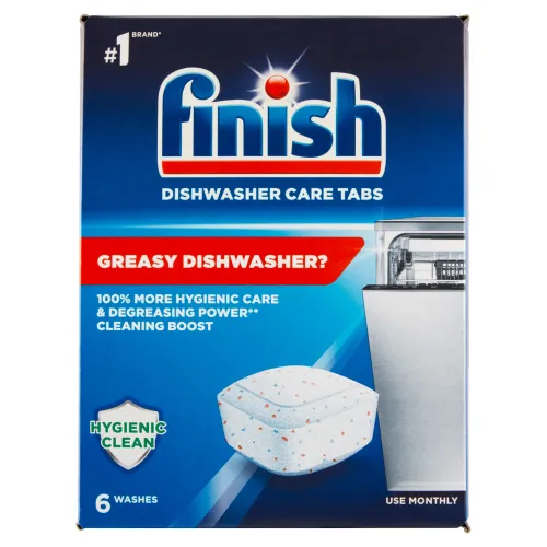 Aj keď si umývačka poradí so špinavým riadom, môžu jej zvyšky mastnoty a špiny uniknúť a hromadiť sa vo vnútri umývačky. Kapsule Finish na čistenie umývačky odstraňujú mastnotu a špinu z umývačky, ktorá medzitým umyje riad. Pre 100% hygienickejšiu starostlivosť o umývačku**.