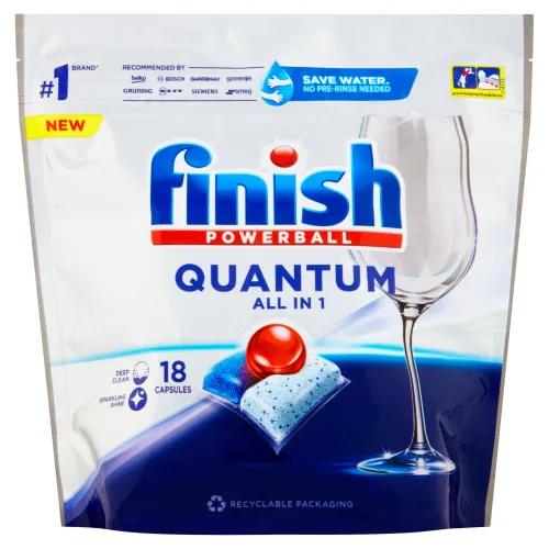 Finish Quantum All in 1, pre skutočnú čistotu a žiarivý lesk vždy a hneď na prvýkrát. Jeho kompaktne trojkomorové zloženie je efektívne pri odstraňovaní všetkých typov nečistôt od jedla - dokonca bez predumývania. S o 25% menej chemickej záťaže vs Finish Power.
