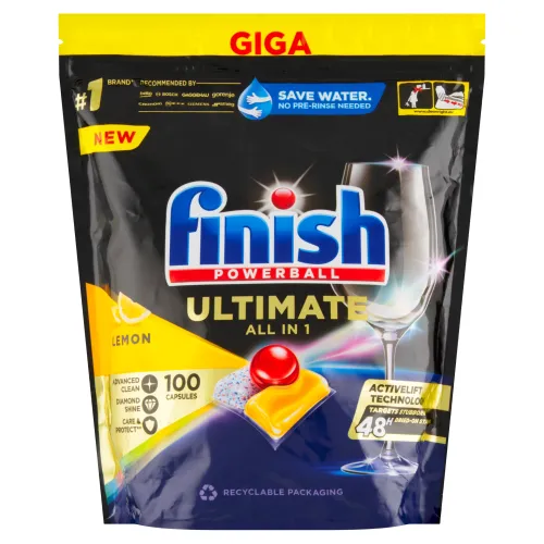 Finish Ultimate All in 1, pre pokročilú čistotu a diamantový lesk vždy a hneď po prvýkrát. Kapsula s technológiou Activelift účinne rozkladá všetky druhy zvyškov jedla, dokonca aj odolné škvrny zaschnuté 48 h, a to bez potreby predumývať. Kapsuly chránia a starajú sa o váš sklenený riad a príbory a udržujú ich lesk s každým umývaním. Náš ultimátny výkon s o 15 % nižšou hmotnosťou chemikálií v porovnaní s tabletami Finish Power All in 1.