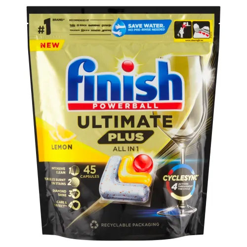 Kapsuly Finish Ultimate Plus All in 1 na intenzívne čistenie a diamantový lesk na prvýkrát. Ide o vôbec prvú kapsulu s technológiou Cyclesync™, ktorá uvoľňuje tu správnu zložku*** v správnom čase. Pokročilé zloženie si poradí aj s odolnými škvrnami bez potreby predumývania a poskytuje 4 činnosti počas celého mycieho cyklu. Kapsuly chránia a ošetrujú sklenený riad a príbory a udržiavajú ich lesk pri každom umývaní. Náš revolučný výkon s o 15 % nižšou hmotnosťou chemikálií v porovnaní s tabletami Finish Power All in 1.
