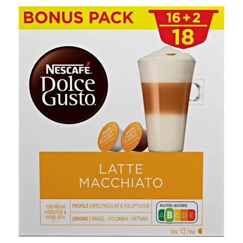 - 8 kávových a 8 mliečnych kapsúl pre 8 šálok (220 ml) NESCAFÉ® Dolce Gusto® Latte Macchiato.