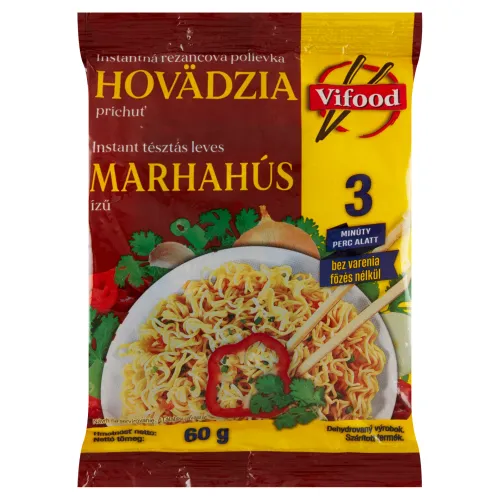 Zloženie: Instantné cestoviny (94,3 %): pšeničná múka, palmový olej, jedlá soľ, pšeničný glutén, zahusťovadlo (E412), regulátory kyslosti (E500ii, E170i), zvlhčovadlo (E451i), Sypké dochucovadlo (5,7 %): jedlá soľ, maltodextrín, zvýrazňovače chuti (E621, E627, E631), zmes sušenej zeleniny (0,57 %): cesnak, cibuľa, chilli paprika, zeler, paprika; cukor, sójový bielkovinový hydrolyzát, paradajkový prášok, aróma (hovädzia), modifikovaný kukuričný škrob, slnečnicový olej, regulátor kyslosti (E330), čierne korenie mleté, farbivo (E150d), chilli mleté