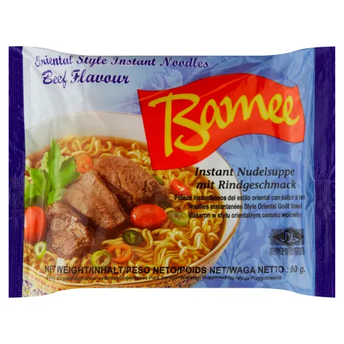 Zloženie: Zloženie suchej zmesi:, Rezance 53g: pšeničná múka (lepok) 65,01%, tapiokový škrob, palmový olej, jedlá soľ, cukor, zahusťovadlo E466, regulátor kyslosti: E500, E501, E451, sójová omáčka (sója, voda, jedlá soľ), Koreniaci prípravok:, Práškové vrecko: jedlá soľ, cukor, zvýrazňovače chutnosti: E 621, E 635, hovädzia príchuť 0,82%, sušený ázijský aromatický pór, sójová omáčka v prášku (sója), farbivo: E 150c, zeler, korenie, Olejové vrecko: palmový olej, cibuľa šalotka