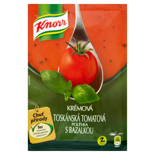 Zloženie: Zloženie v dehydrovanom stave:, Paradajkový prášok 28%, Cukor, Pšeničná múka, Rastlinný tuk a olej (palmový, slnečnicový), Škroby (kukuričný, hrachový, zemiakový), Soliaca zmes (jódovaná jedlá soľ, jedlá soľ, chlorid draselný), Kvasničný extrakt, Mletá zelenina (cibuľa, pór, červená repa), Extra panenský olivový olej 2,7%, Maltodextrín, Srvátka, Laktóza, Zeleninová šťava koncentrovaná (zo zeleru, cibule, mrkvy, póru), Zmes korenín (kurkuma, čierne korenie 0,02%), Zmes bylín (oregano 0,21%, bazalka 0,15%), Sušená citrónová šťava, Arómy