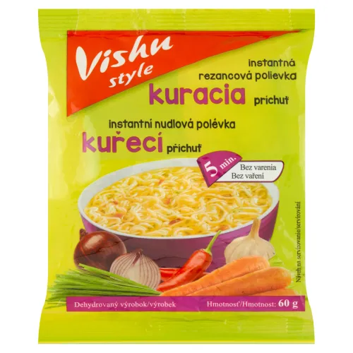 Zloženie: Instantné cestoviny (86,3 %): pšeničná múka, palmový olej, pšeničný glutén, jedlá soľ, regulátory kyslosti (E500ii, E170i), zvlhčovadlo (E451i), zahusťovadlo (E412), Vrecká s príchuťami (13,7 %): sypké ochucovadlo (8,3 %): jedlá soľ, cukor, zvýrazňovače chuti (E621, E627, E631), sójový bielkovinový hydrolyzát, čierne korenie mleté, chilli mleté (0,09 %), kurkuma aróma (kuracia), farbivo (E150d); zmes sušenej zeleniny v rôznom pomere (1,7 %): mrkva, pažítka, cibuľa, cesnak; palmový olej (3,7 %)