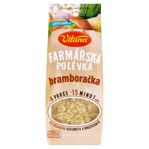 Zloženie: Sušená zelenina (zemiaky 28 %, zemiakové vločky 16 %, cesnak 4,6 %, karotka, cibuľa 1,1 %, petržlen, zeler, pór 0,6 %), Predvarené jačmenné krúpy 23 %, Prírodné arómy (lepok, sója, mlieko, zeler), Jedlá soľ, Sušené huby 3,7 % (šampiňóny 3,4 %, hríby 0,23 %), Škvarená slanina, Majorán 0,8 %, Zmes korenín