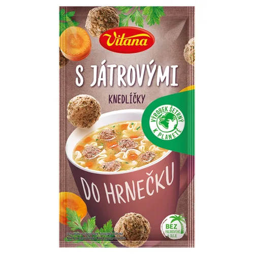Zloženie: Zloženie suchej zmesi:, Sušené pečeňové knedličky 25 % (pečeňová závarka mletá 30%, palmový tuk, vajcia, škrob, pšeničná múka, zemiakové vločky, palmový tuk, kvasnicový extrakt, laktóza, zmes korenín, droždie, kypriace látky: difosforečnan disodný, hydrogénuhličitan sodný), Semolinové cestoviny (pšeničná múka), Modifikovaný škrob, Laktóza, Jedlá soľ, Arómy, Repkový olej, Sušená pečeňová závarka mletá 5,7 % (pečeň 31 %, hovädzie mäso, pšeničná múka, vaječný bielok, jedlá soľ, sušený sójový hydrolyzát, droždie, zmes korenín, palmový tuk), Zelenina 3,2 % (mrkva, cibuľa, petržlenová vňať 0,3 %), Extrakt z čierneho korenia, Farbivá (karamel farbivo E150c, riboflavín), Kyselina citrónová E330
