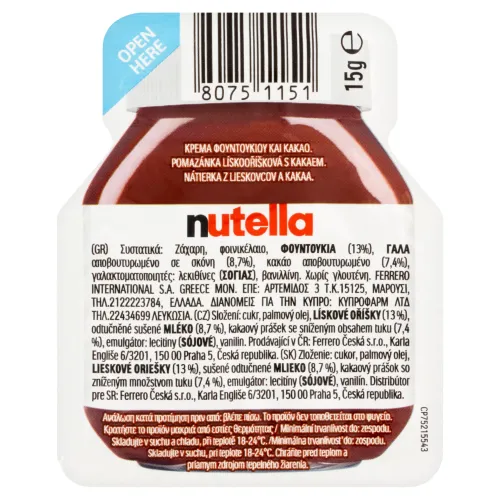 Zloženie: Cukor, Palmový olej, Lieskové oriešky (13%), Sušené odtučnené mlieko (8,7 %), Kakaový prášok so zníženým množstvom tuku (7,4 %), Emulgátor: lecitíny (sójové), Vanilín