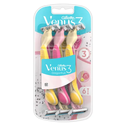 Dámske jednorazové holiace strojčeky Gillette Venus 3 Dragonfruit poskytujú dôkladné oholenie za skvelú cenu. Tieto dámske jednorazové holiace strojčeky majú 3 čepieľky, ktoré sa prispôsobujú krivkám tela, a sú vybavené výkyvnou holiacou hlavicou, ktorá reaguje aj na tie najjemnejšie zmeny kriviek vášho tela. Tieto holiace strojčeky majú vodou aktivovaný lubrikačný indikátorový pásik, ktorý uľahčí kĺzavý pohyb pri holení. Lubrikačný indikátorový pásik je doplnený o vitamín E. Tieto jednorazové dámske pomôcky sú dostupné s rukoväťami vo viacerých farbách a s vôňou pitahaye, aby ste pri holení cítili sviežu tropickú vôňu.