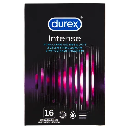 Durex intense sú vrúbkované prezervatívy so stimulujúcimi výstupkami a stimulujúcim gélom.