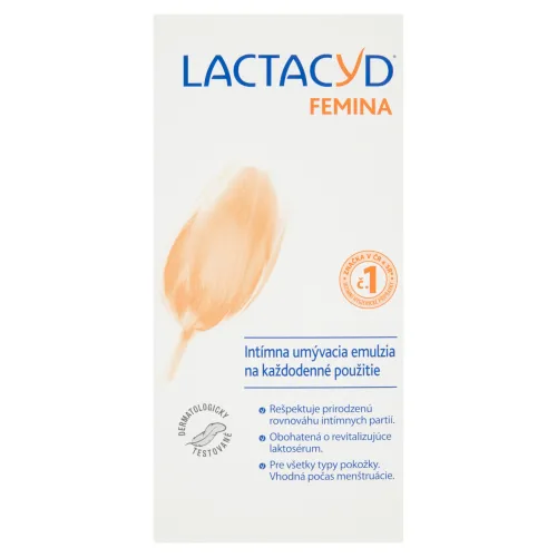 Umývacia emulzia Lactacyd Femina je vyvinutá tak, aby pôsobila v súlade s vaším telom a pomáhala chrániť prirodzenú rovnováhu intímnych partií. Vďaka obsahu kyseliny mliečnej a zmesi doplňujúcich zložiek dodáva vyživujúci a svieži pocit, a tak vám pomáha vyhnúť sa každý deň a po celý deň nepríjemným pocitom.