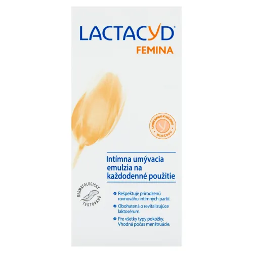 Umývacia emulzia Lactacyd Femina je vyvinutá tak, aby pôsobila v súlade s vaším telom a pomáhala chrániť prirodzenú rovnováhu intímnych partií. Vďaka obsahu prírodnej kyseliny mliečnej a zmesi doplňujúcich zložiek dodáva vyživujúci a svieži pocit, a tak vám pomáha vyhnúť sa každý deň a po celý deň nepríjemným pocitom.