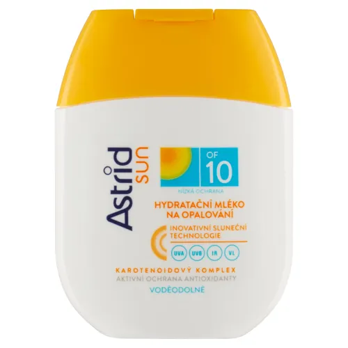 Astrid Sun Hydratačné mlieko na opaľovanie OF 10 s inovatívnou slnečnou technológiou (UVA/UVB/IR*/VL*) poskytuje pokožke širokospektrálnu fotostabilnú ochranu pred škodlivými vplyvmi UV a infračerveného žiarenia a viditeľného svetla.