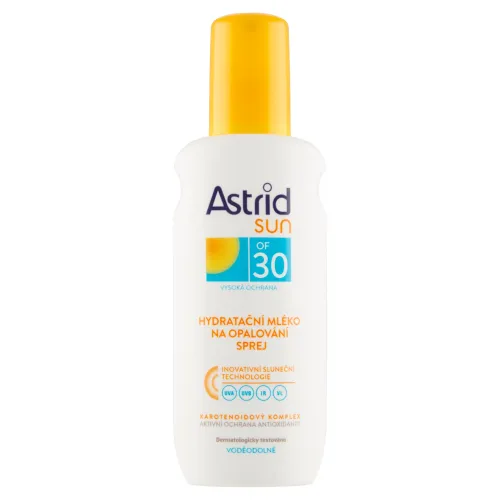 Astrid Sun Hydratačné mlieko na opaľovanie v spreji OF 30 s inovatívnou slnečnou technológiou (UVA/UVB/IR* /VL*) poskytuje pokožke širokospektrálnu fotostabilnú ochranu pred škodlivými vplyvmi UV a infračerveného žiarenia a viditeľného svetla.