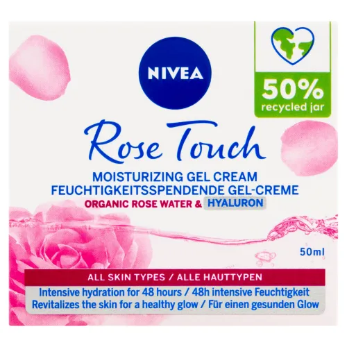 Nivea® Hydratačný denný gél-krém Rose Touch s organickou ružovou vodou a kyselinou hyalurónovou revitalizuje pleť a intenzívne ju hydratuje celých 48 h. Pleť zanechá jemnú, zamatovo hebkú a rozjasnenú.