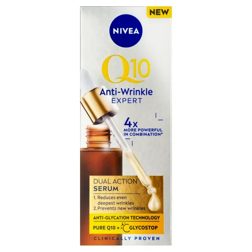 Nivea® Expertné duálne sérum proti vráskam Q10 s inovatívnym zložením s technológiou proti glykácii pôsobí dvojakou silou: