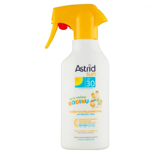 Astrid Sun Rodinné mlieko na opaľovanie v spreji OF 30 s inovatívnou slnečnou technológiou (UVA/UVB/IR*/VL*) poskytuje pokožke širokospektrálnu fotostabilnú ochranu pred škodlivými vplyvmi UV žiarenia a ochranu pred infračerveným žiarením (IR)* a viditeľným svetlom (VL)*. Mlieko obohatené o provitamín D a bisabolol bolo špeciálne vyvinuté na ochranu citlivej pokožky intolerantnej ku slnečnému žiareniu. Zloženie bolo vyvinuté tak, aby sa minimalizovalo riziko alergických reakcií. *Test in vitro na IRA a HEVL.