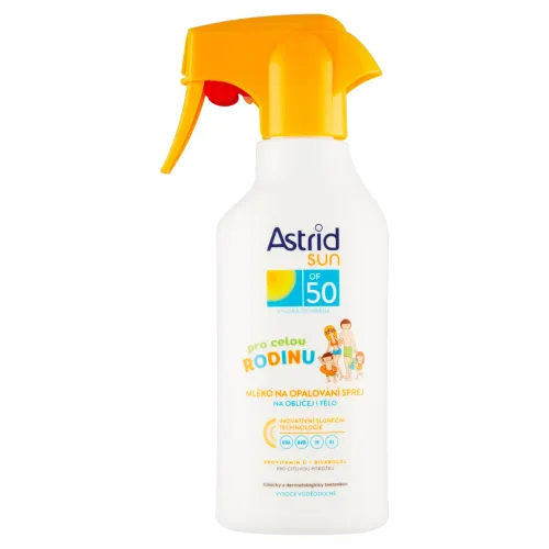 Astrid Sun Rodinné mlieko na opaľovanie v spreji OF 50 s inovatívnou slnečnou technológiou (UVA/UVB/IR*/VL*) poskytuje pokožke širokospektrálnu fotostabilnú ochranu pred škodlivými vplyvmi UV žiarenia a ochranu pred infračerveným žiarením (IR)*. a viditeľným svetlom (VL)*. Mlieko obohatené o provitamín D a bisabolol bolo špeciálne vyvinuté tak, aby pomohlo ochrániť citlivú pokožku intolerantnú na slnečné žiarenie. Zloženie bolo vyvinuté tak, aby sa minimalizovalo riziko alergických reakcií.