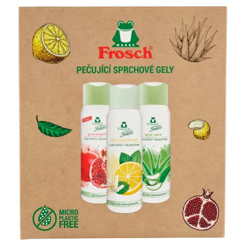 Darčekovou súpravou Frosch potešíte nielen svojich blízkych, ale aj prírodu. Produkty so zelenou žabičkou na obale sú priateľské k našej pokožke aj životnému prostrediu vďaka šetrnému a v prírode odbúrateľnému zloženiu, ekologickej výrobe i recyklovaným a opätovne recyklovateľným obalom.