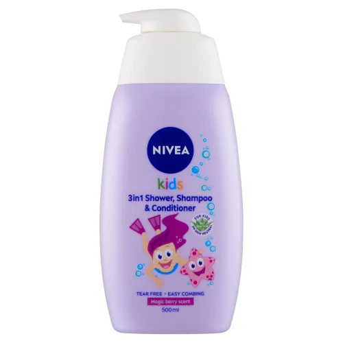 Nivea® Kids Sprchovací gél, šampón a kondicionér 3 v 1 s Bio Aloe Vera a Harmančekom šetrne umýva a ošetruje jemnú detskú pokožku a vlásky.