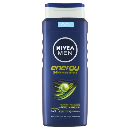 Sprchovací gél na telo, tvár a vlasy s výťažkami z mäty. 99% zloženia je biologicky rozložiteľných (na základe OECD alebo ekvivalentných metód).