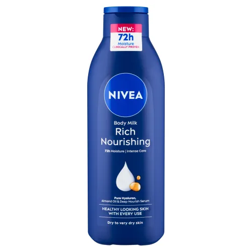 Nivea® Výživné telové mlieko rich nourishing hĺbkovo hydratuje aj veľmi suchú pokožku až 72 hodín. Rýchlo sa vstrebávajúce a nemastné zloženie je obohatené o čistú kyselinu hyalurónovú, mandľový olej a hĺbkovo vyživujúce sérum.