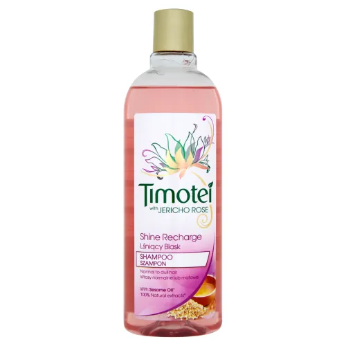 Šampón Timotei Oslnivý lesk obohatený o výťažky zo sezamového oleja* oživuje matné vlasy a dodáva im prirodzený lesk**.