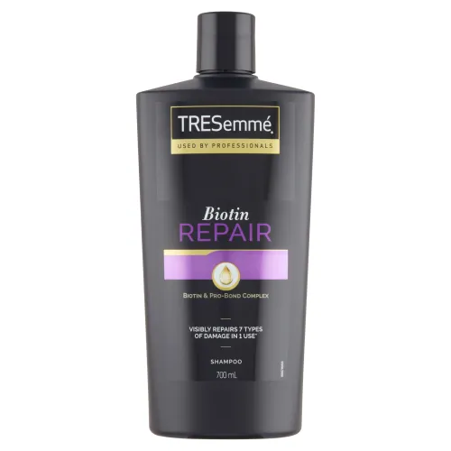 Váš obľúbený šampón je teraz k dispozícii v novom, väčšom formáte! Skoncujte so suchými a zničenými vlasmi, a to vďaka regeneračnému šampónu Tresemmé Repair Biotin, ktorý viditeľne napráva až 7 druhov poškodenia vlasov spôsobených farbením, žehlením, česaním, zapletaním, fénovaním, kulmovaním či odfarbovaním. Zloženie s Biotin & Pro-Bond komplexom obsahuje patentovanú zmes molekúl, ktoré prenikajú priamo do vlasových vlákien tak, aby vo vlasoch obnovili ich poškodené väzby. Toto inovatívne zloženie posilňuje každý pramienok vašich vlasov zvnútra aj zvonku. Vlasy sú chránené a vy môžete pokračovať v ich úprave. - Viditeľne napráva až 7 druhov poškodenia vlasov - Zloženie s Biotin & Pro-Bond komplexom - Vo vlasoch obnovuje ich poškodené väzby - Určené pre suché, poškodené vlasy - Vhodné aj pre farbené vlasy.