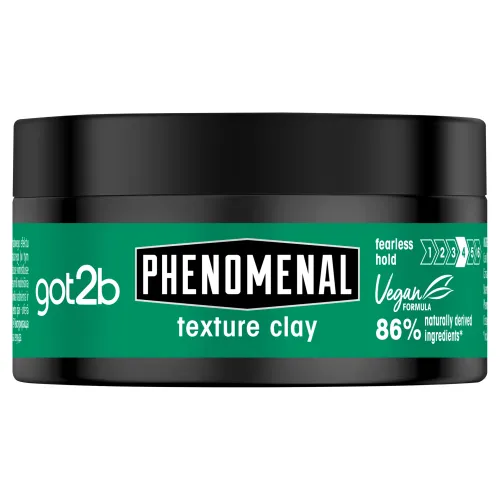 Ukážte silu svojich vlasov! Got2b Phenomenal textúrovacia hlina dodá účesu matný a textúrovaný povrch počas sekundy. So silnou vôňou a fixáciou. Zloženie je vegánske* s 86% prírodných zložiek**. Dóza a viečko sú určené na recykláciu***.
