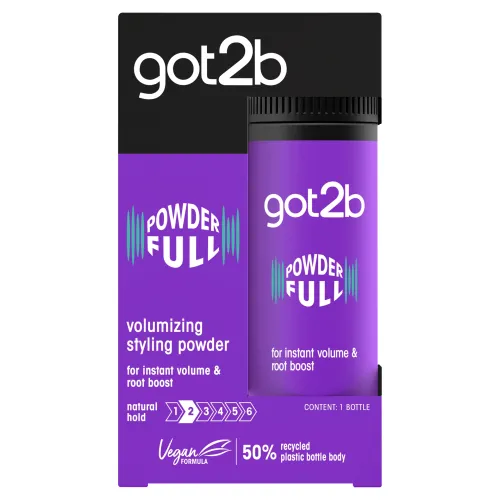 Nafúknite objem svojho účesu do výšin! Got2b Powder'ful objemový stylingový púder pre okamžitý objem od korienkov. Nezaťažujúce zloženie dodáva textúru každému prameňu vlasov pre plnší vzhľad s prirodzenou fixáciou. Zloženie je vegánske*. Telo fľaše z 50% recyklovaného plastu.