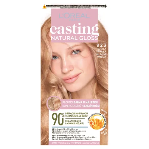 Casting Natural Gloss od L'Oréal Paris má z 90 % prírodné zloženie, ktoré prirodzene kryje prvé šediny. Stará sa o každý prameň, vyhladzuje vlasy a zanecháva ich až 3x lesklejšie a hebkejšie. Odtiene sú vyvinuté pre všetky typy vlasov. Farba sa postupne vymýva až na váš prirodzený odtieň v priebehu 28 umytí.
