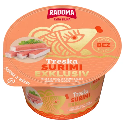 Zloženie: Treska exklusiv 78,5% [treskovité ryby 45%, repkový olej, voda, mrkva, kvaka, cibuľa, cukor, horčica (voda, horčičné semeno, kvasný ocot liehový, glukózový sirup, soľ, koreniny), modifikované škroby, regulátory kyslosti: kyselina octová, mliečnan sodný, kyselina mliečna; ryžová múka, sušený vaječný žĺtok, soľ, konzervačná látka: sorban draselný; dextróza, stabilizátory: E412, E415; uhorky], Surimi s krabou arómou 20% [voda, surimi 22% (rybie mäso, stabilizátory: E420, E450, E451, E452; cukor), škrob (obsahuje pšenicu bez gluténu), repkový olej, vaječné bielky, sójová bielkovina, soľ, cukor, zvýrazňovače chuti: E621, E631, E627; farbivá: E120, E160c; aróma], Cukor