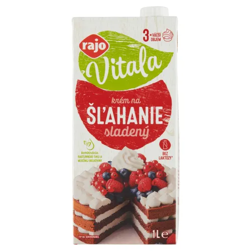 Aš 3x väčší objem po našľahaní Výborne sa hodí do tortových náplní, na zdobenie rôznych dezertov, pudingov, či zmrzliny. Stabilná bez použitia stužovadiel Vysoká a pevná pena po našľahaní si dlhodobo udrží svoj objem bez ďalšieho použitia stužovadiel alebo iných prísad. Lahodná chuť bez laktórzy* Ideálna alternatíva, ktorú si môžu vychutnať aj ľudia s laktózovou intoleranciou. *Množstvo laktózy najviac 0,01 g na 100 ml. Jednoduché použitie a zaručený výsledok Vy si užívate pečenie a Rajo Vitala sa postará dokonalý výsledok.